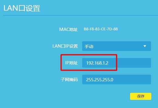 在路由器2的设置页面,找到“LAN口设置”或者“局域网设置”的选项,把路由器2的IP地址,修改成和路由器1的IP地址,在同一个网段。