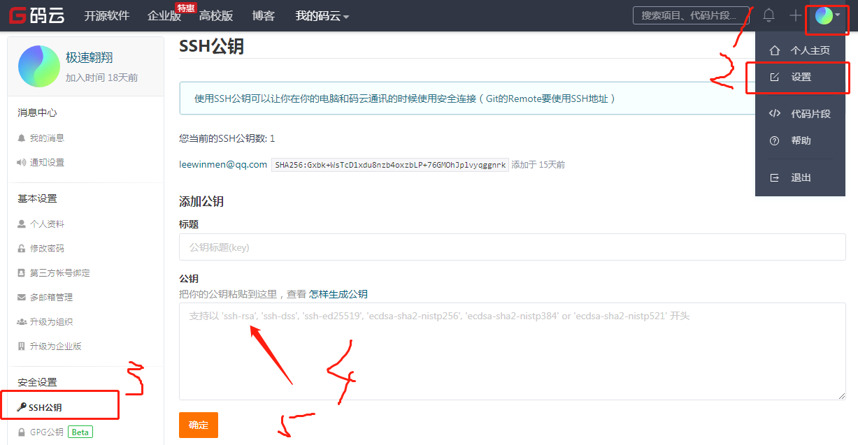 先来看C:\Users\你的名字\ .ssh文件夹\ id_rsa.pub里面的SSH怎么填写到不同的代码托管网站.