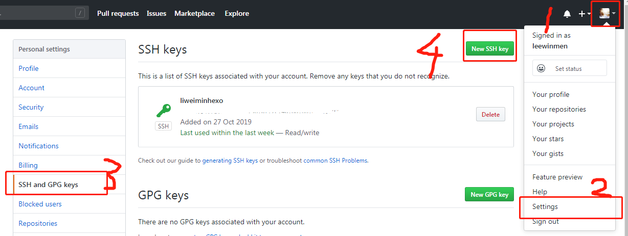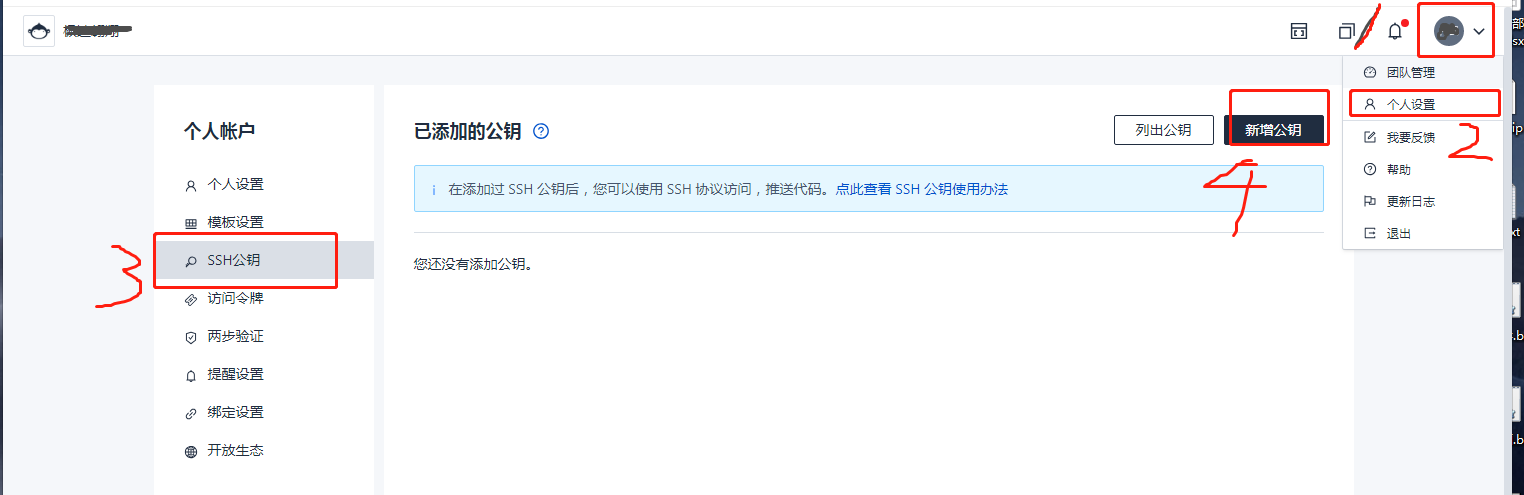 之后是ssh,到C:\Users\你的名字\ .ssh文件夹\ id_rsa.pub,打开它,复制到github或码云或者coding。