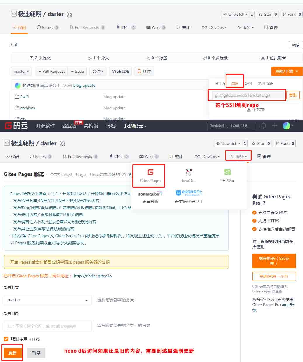 码云的平台比较特殊,偶尔你hexo d了他也没更新网页,你需要在page里面强制更新。