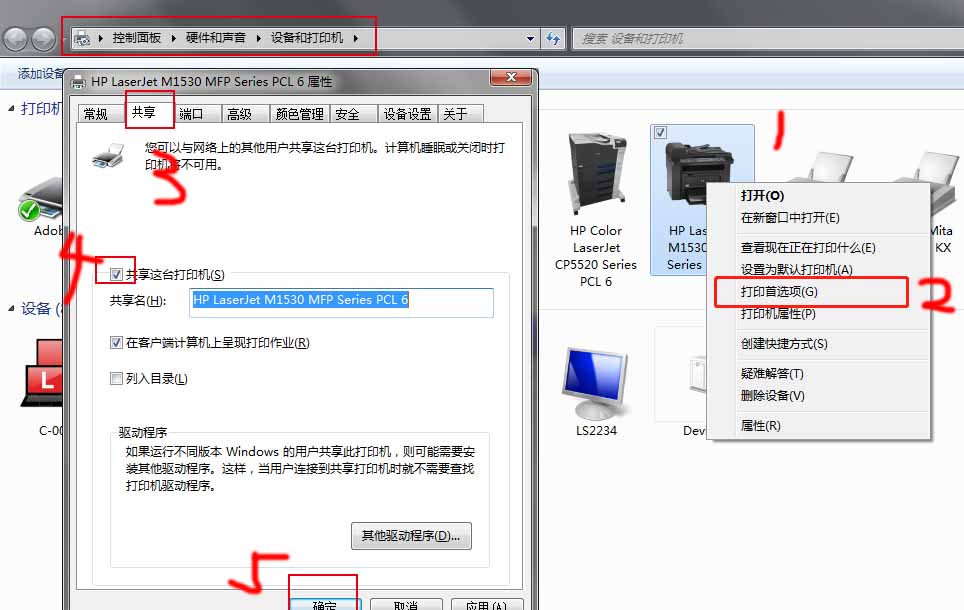 2在设备与打印机共享打印机
